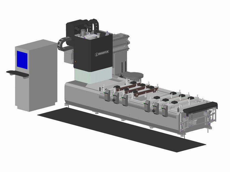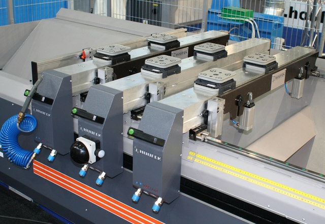 - Obráběný polotovar se upíná pomocí podtlaku na ručně přestavitelné konzoly (trámce) jezdící na podstavci po lineárním kuličkovém vedení ve směru osy X s pneumaticky ovládaným odaretováním polohy konzol. Všech 6 konzol je vybaveno zadními dorazovými čepy a dvěma upínacími bloky. Polohu jednotlivých konzol a upínacích bloků lze odečíst z nalepených měřících pásek. Pro usnadnění nakládání rozměrných polotovarů na stůl, slouží 4 pomocné lišty vysouvané pneumatickými válci. Alternativou trámcového stolu je stůl pevný, tzv. rastrový, vybavený rovněž zadními dorazovými čepy a vakuovými upínacími bloky. Stůl je zpravidla rozdělen na 2 pracoviště, ale lze ho také využívat jako jednopracovišťový po softwarovém spojení obou pracovišť. Jako zdroj podtlaku slouží vakuová pumpa s kapacitou odsávání vzduchu min. 100m3 / hod.