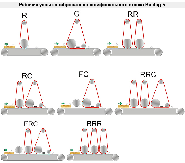 Широколенточный калибровально-шлифовальный станок Buldog 5 представляет собой модульную конструкцию, что позволяет изготавливать станки в соответствии с требованиями заказчика. Чтобы обеспечить возможность выполнения тех или иных задач, станки могут быть оснащены такими узлами и их сочетаниями: