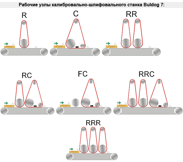 Широколенточный калибровально-шлифовальный станок Buldog 7 представляет собой модульную конструкцию, что позволяет изготавливать станки в соответствии с требованиями заказчика. Чтобы обеспечить возможность выполнения тех или иных задач, станки могут быть оснащены такими узлами и их сочетаниями: