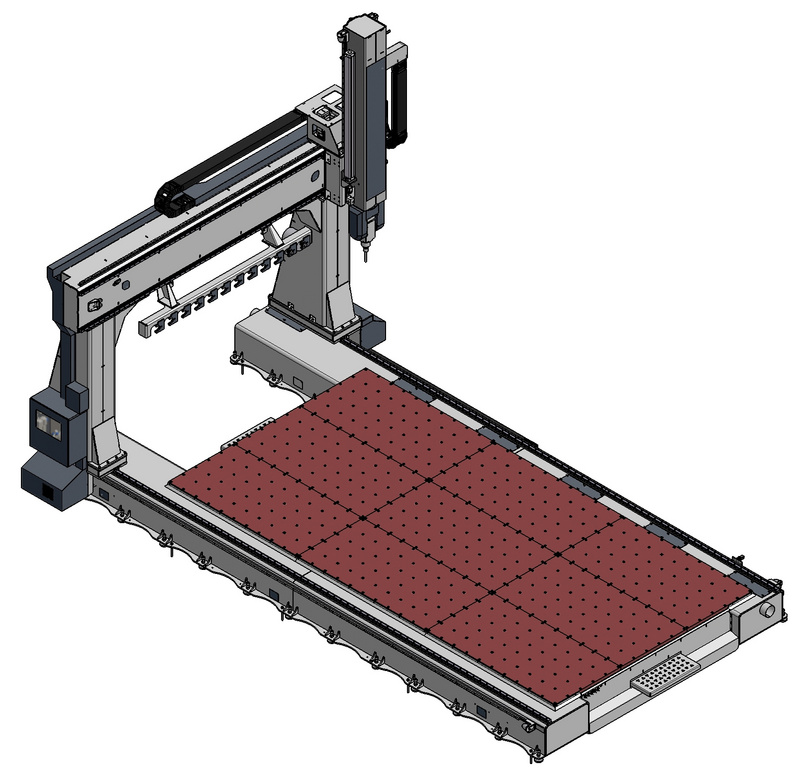 - Obráběný polotovar se upíná na hladký stůl pomocí mechanických upínek do závitových otvorů nebo do T-drážek. Alternativou hladkého stolu je stůl rastrový, ve kterém je rozvedeno vakuum pro upínání obrobků. Jako zdroj podtlaku slouží vakuová pumpa s kapacitou odsávání vzduchu min. 100m3 / hod. Stůl je zpravidla rozdělen na 2 pracoviště, ale lze ho také využívat jako jednopracovišťový po softwarovém spojení obou pracovišť.